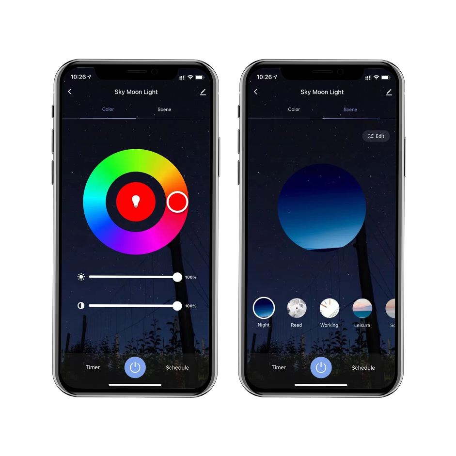The smart app allows you to take full control of the Galaxy Projector. Unlimited color combinations, an RGB dial, ability to control the effect brightness, set timers and schedules and so much more.
